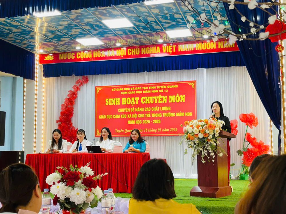 Sáng ngày 18/3/2026, Trường Mầm non Đông Thành đã tham gia buổi sinh hoạt chuyên môn lần thứ III của Cụm Giáo dục mầm non số 13, được tổ chức tại Trường Mầm non Vĩnh Tuy (xã Vĩnh Tuy). Buổi sinh hoạt thu hút gần 90 cán bộ quản lý, giáo viên cốt cán đến từ 22 trường mầm non trong cụm, nhằm trao đổi, chia sẻ kinh nghiệm và nâng cao chất lượng giáo dục cảm xúc – xã hội cho trẻ trong giai đoạn hiện nay.